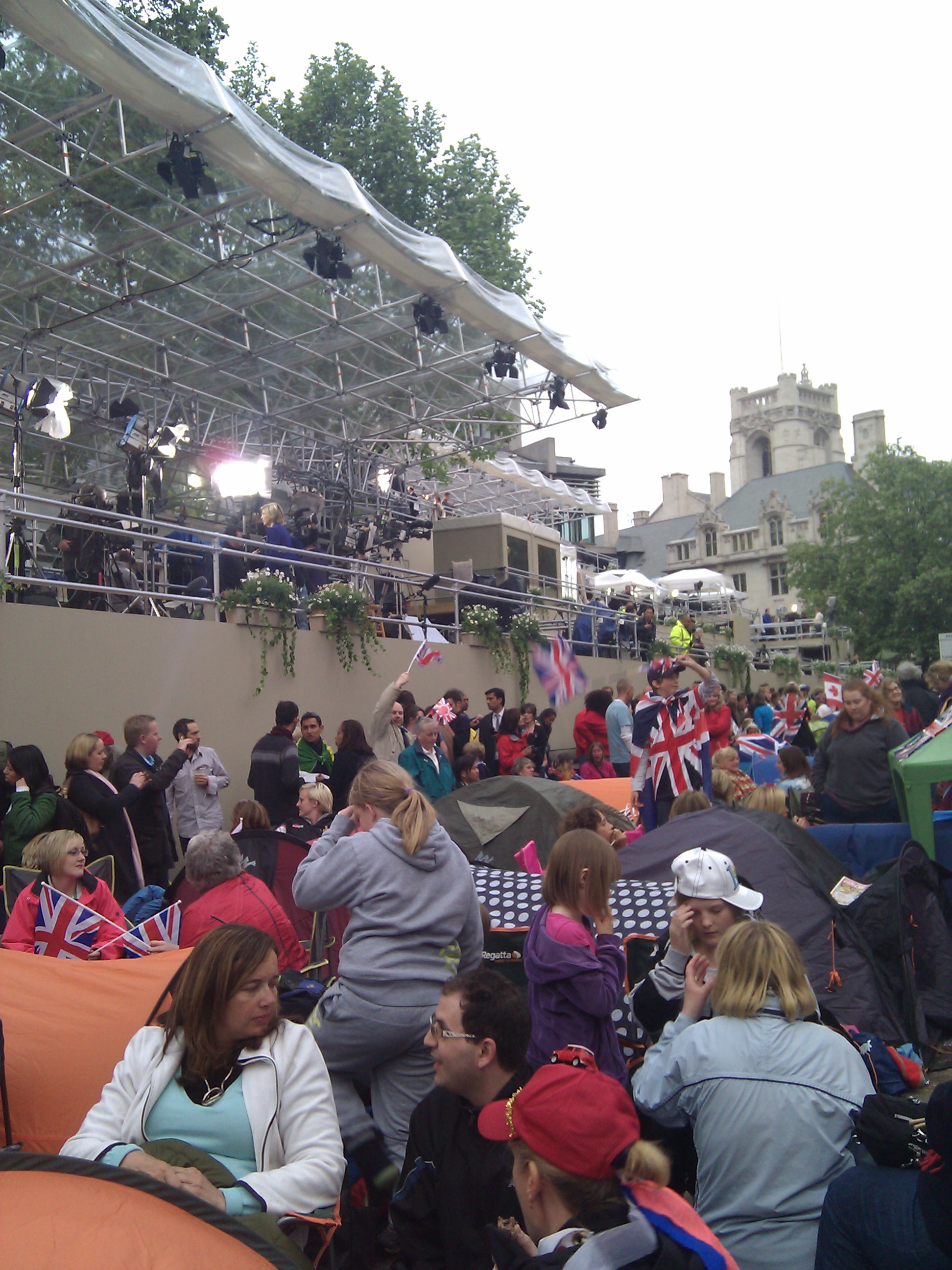 Hair up, tiara on, wedding dress in bag, I ventured to the Mall. St John’s Ambulances lined up in a street beside the Mall. TV crews set up their kit half way up the steps to Waterloo Place. People were split into groups of no-nonsense Londoners on their way home, and cheery flag-wavers, chattering excitedly amongst themselves about what would happen along this famous road 18 hours later.