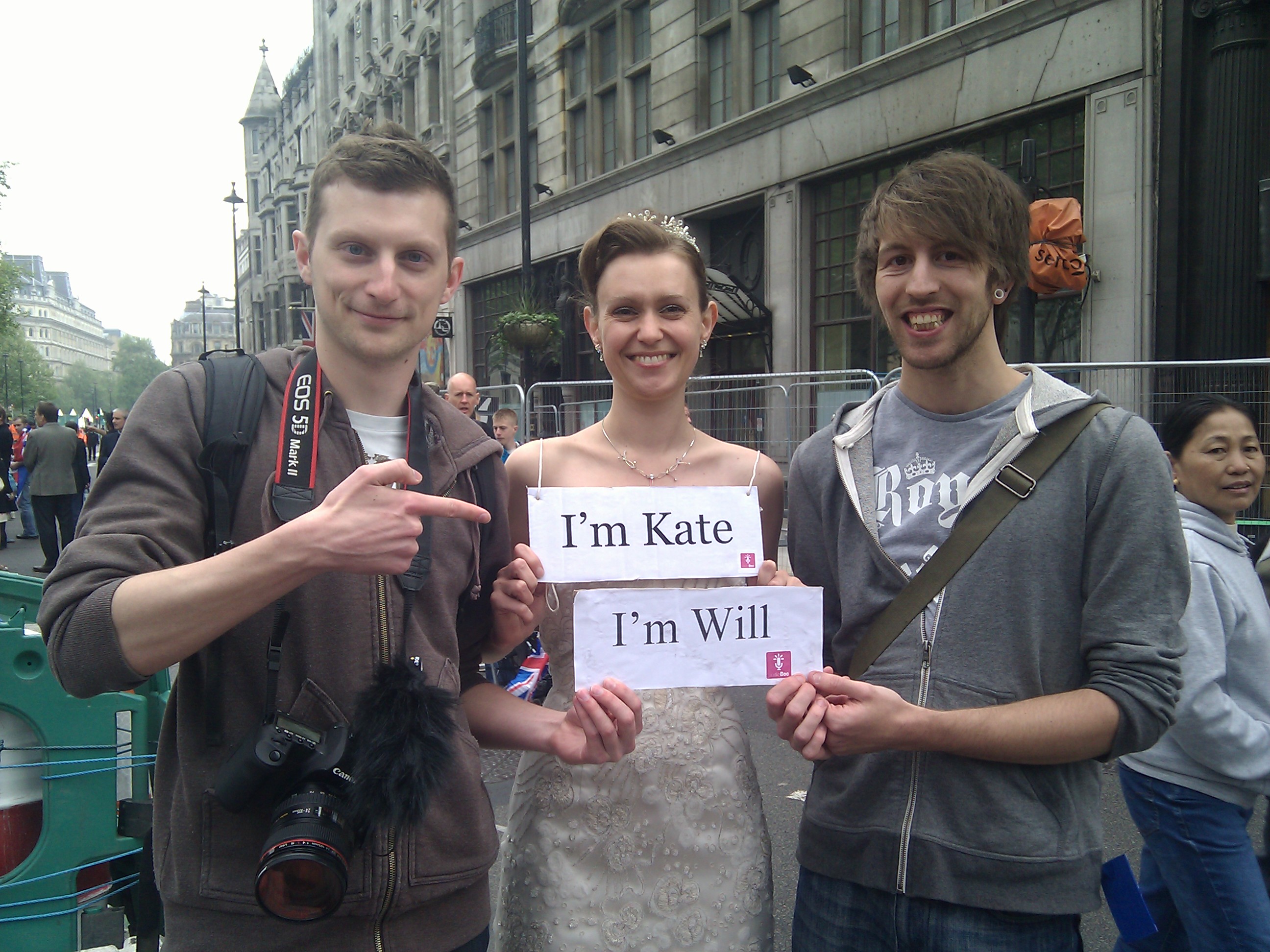 Audioboo boss Mark Rock steadied my nerves with a rum and coke (double) in St Stephen’s Tavern. While there I got talking to some exuberant Americans that had flown in for the wedding. The sight of Kevin’s sequined union jack waistcoat, apparently only a small part of his royal wedding outfit was enough to convince me I wasn’t the only one who’d look stupid. I headed down the stairs to the pub toilets and came (sheepishly) back up as #WeddingKate. It took a bit less explaining that I thought it would as I re-entered the upstairs bar, bedecked as I was, in a full-on wedding gown. I got more smiles than roll-your-eyes stares (which is probably what I would have done had the situation been reversed). Maybe royal wedding fever really had finally reached the capital, or perhaps all those who wanted no part of it wouldn’t be found within several miles of its epicentre and were thus absent.