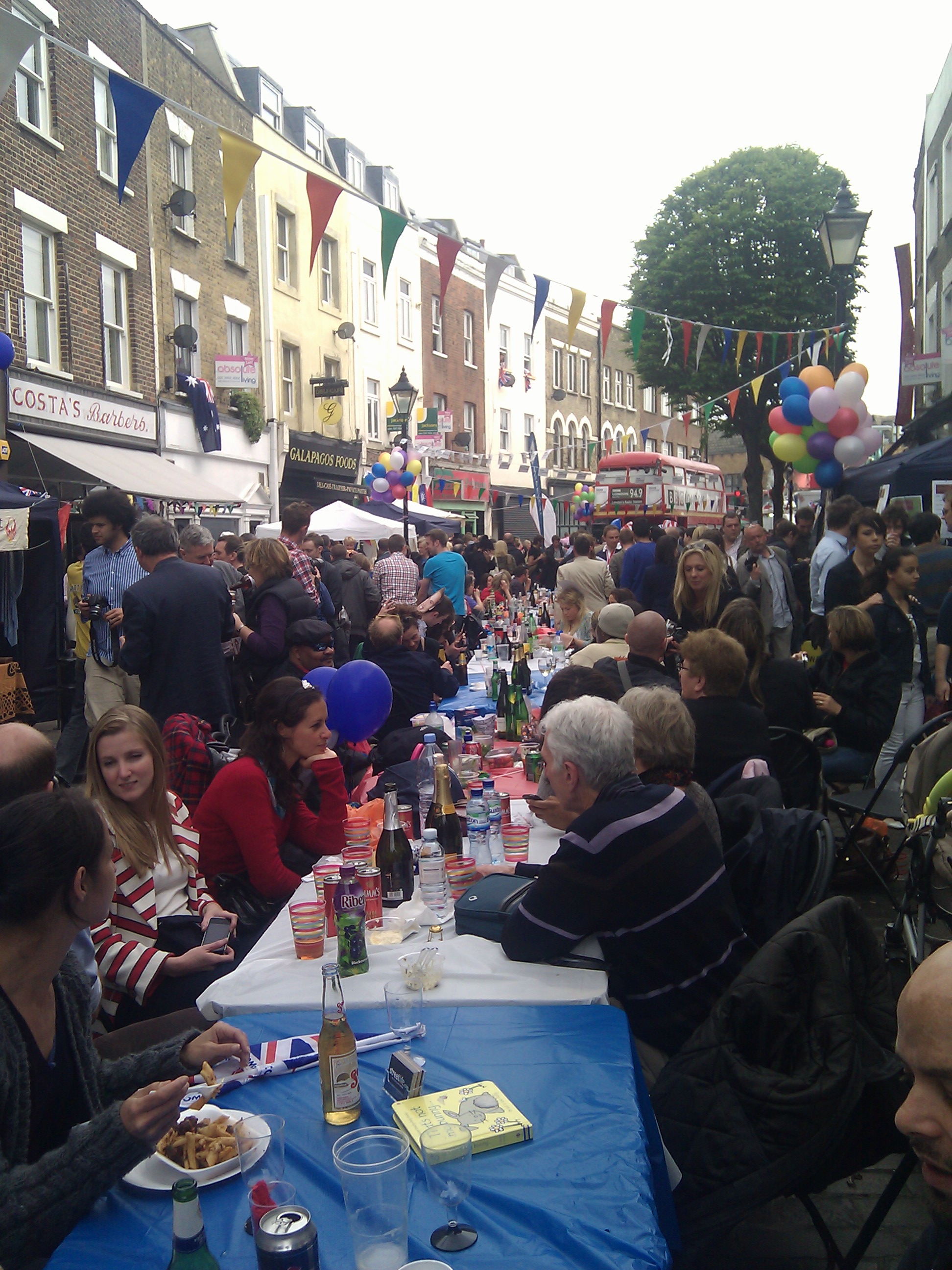 A full on street party at last! Tables lined up along the centre of the street, people eating, drinking and having fun together. A big screen next to BBC London’s outside broadcast routemaster bus showed highlights of the wedding. People drinking Pimms sat on the road in front of the screen.